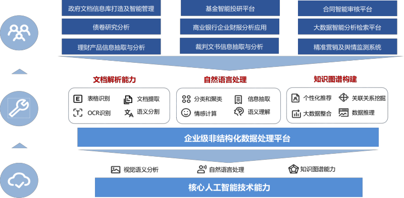 智能思創(chuàng)的企業(yè)級非結(jié)構(gòu)化處理平臺主要處理的是文檔、影像件等非結(jié)構(gòu)化數(shù)據(jù),通過視覺語義分析和自然語言處理,將結(jié)構(gòu)化數(shù)據(jù)轉(zhuǎn)化為非結(jié)構(gòu)化數(shù)據(jù),后續(xù)根據(jù)不同業(yè)務(wù)場景對結(jié)構(gòu)化數(shù)據(jù)進行關(guān)聯(lián)與分析,協(xié)助人們快速的閱讀、理解和分析各類文檔內(nèi)容,降低企業(yè)、政府及各種組織中文檔的重復閱讀、整理和分析的工作,提升非結(jié)構(gòu)化數(shù)據(jù)處理效率及數(shù)據(jù)的流動、共享和使用能力。產(chǎn)品已經(jīng)實現(xiàn)了金融行業(yè)(銀行、證券、保險)、煙草、政務(wù)、財政稅務(wù)等行業(yè)領(lǐng)域的場景落地,完成了良好的工程實現(xiàn),并積累了大量的金融、政務(wù)和煙草行業(yè)市場化訓練數(shù)據(jù),形成了技術(shù)壁壘,可以在這些行業(yè)進行良好的拓展。