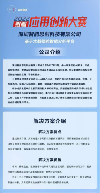 本次,智能思創(chuàng) “大數(shù)據(jù)智能分析平臺(tái)” 鯤鵬應(yīng)用創(chuàng)新大賽榮獲二等獎(jiǎng), 這是行業(yè)對(duì)我司產(chǎn)品的高度 肯定, 我司深耕文檔智能 領(lǐng)域的突出成果。 未來智能思創(chuàng)也將繼續(xù)深固公司產(chǎn)品的基礎(chǔ)技術(shù)和行業(yè)應(yīng)用研發(fā),使之成為市場(chǎng)上具有技術(shù)、行業(yè)雙重壁壘的產(chǎn)品。