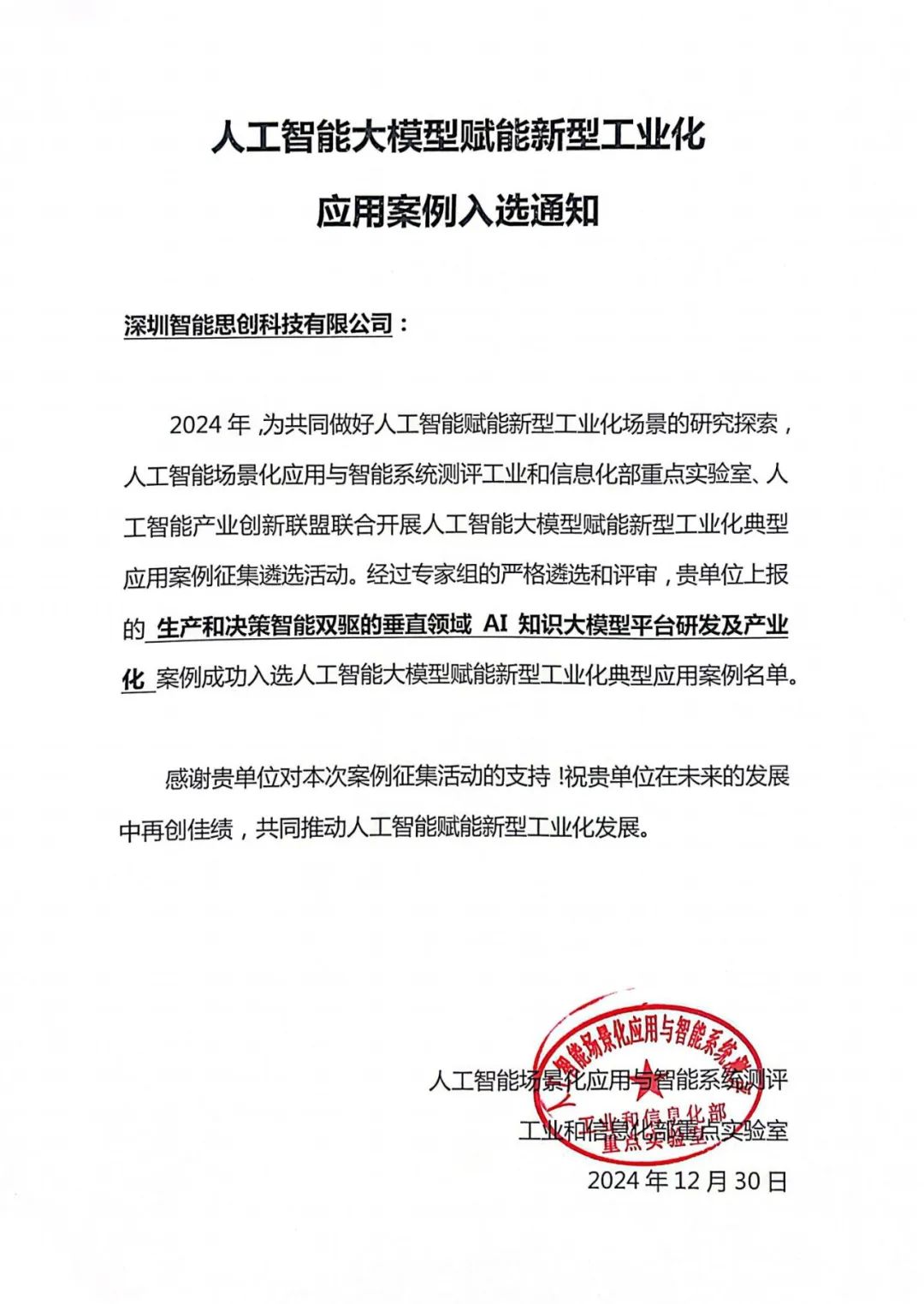 祝賀智能思創(chuàng)AI知識大模型平臺入選人工智能大模型賦能新型工業(yè)化應用案例!