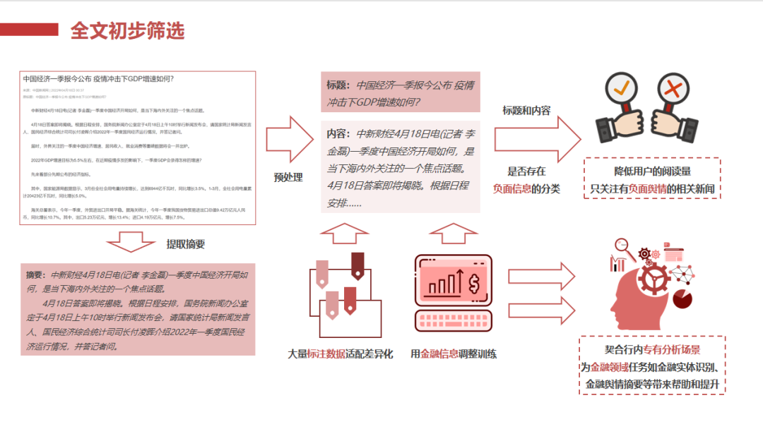 全文初步篩選:通過標(biāo)題和內(nèi)容分析,自動(dòng)識(shí)別負(fù)面信息,并進(jìn)行初步分類,降低用戶閱讀量,聚焦有效信息。
