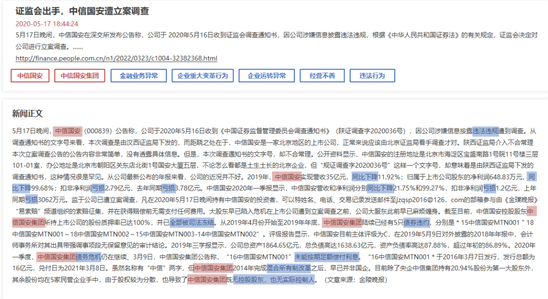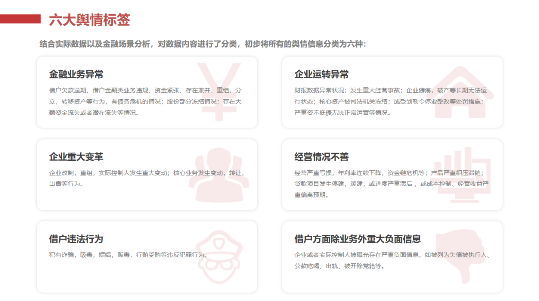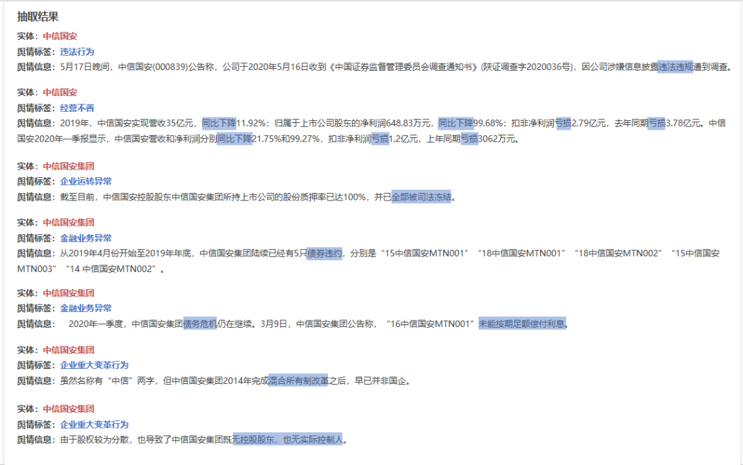 關(guān)鍵信息分析:識(shí)別新聞中的主體公司、風(fēng)險(xiǎn)事件和負(fù)面信息,并進(jìn)行詳細(xì)分類,例如金融業(yè)務(wù)異常、企業(yè)運(yùn)轉(zhuǎn)異常、企業(yè)重大變革等。